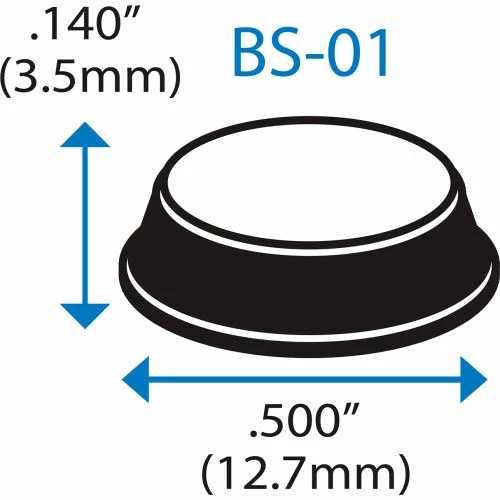 Cylindrical flat top bumper stops are commonly used to protect surfaces and prevent sliding. The flat top shape is ideal for load bearing applications as feet on the bottom of small appliances, cutting boards, or laptops. The flat top design can be used as spacers under glass tables, airflow under network equipment, and behind picture frames to protect walls. Simply peel and stick the bumper feet to your required location. These bumpers can be used everywhere and the application possibilities are endless. Bumper Specialties BS-01 is equivalent to 3M Bumponâ„¢ SJ5001, SJ5012, SJ5301, SJ5312, SJ5412